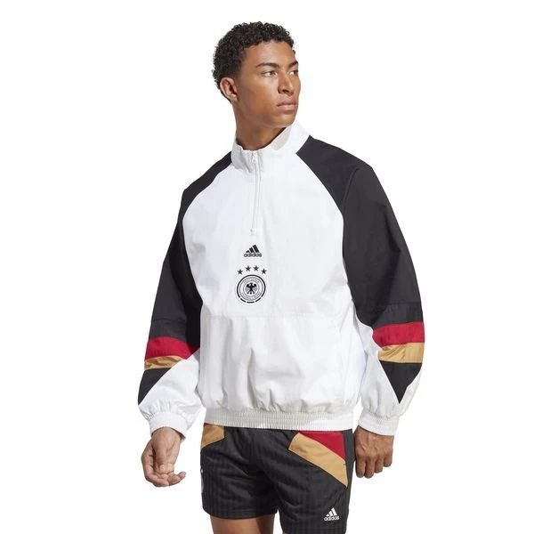 Die Grafik entlang der Schultern. Das zentral platzierte Logo-Badge. Diese auffälligen Komponenten können nur aus einem Jahrzehnt stammen. Diese lässige, locker geschnittene adidas DFB Jacke versprüht 90s-Vibes. Mit ihrem Baumwollmaterial und dem Mesh-Futter trägt sie sich superbequem. Der Reißverschluss bis zur Brust ermöglicht außerdem einfaches und schnelles An- und Ausziehen.Unsere Baumwollprodukte unterstützen einen nachhaltigeren Baumwollanbau.